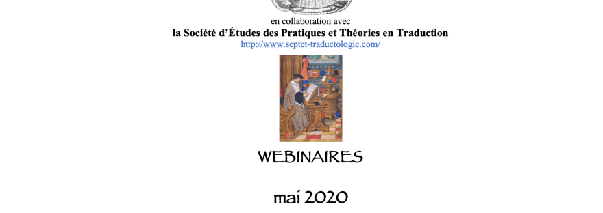 Une série de trois webimaires, trois mardis de suite, dont un mardi dernier, au programme plus qu’alléchant ont lieu pendant cette période difficile. C’est en ligne et c’est accessible à tous, à condition d’être membre de la Société Française de Traductologie (adhésion 30 euros, 20 pour les étudiants). Pour participer, il faut envoyer un mail à soft.univ.paris10@gmail.com, afin de recevoir par la suite les codes zoom. Pas de replay (hop une insertion hétérolingue) possible, donc il faut réserver ses mardis !
